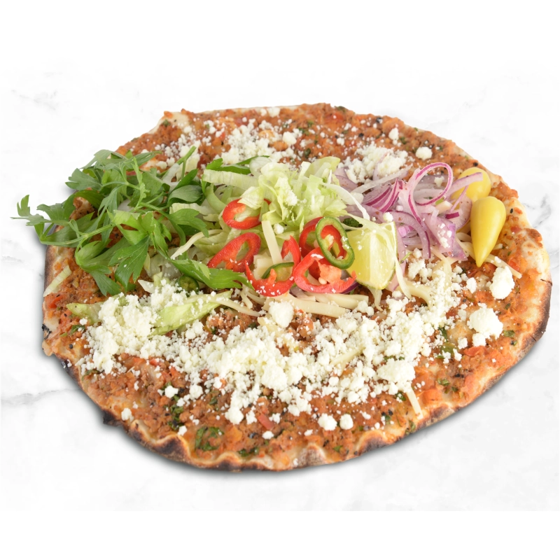 Lahmacun met gesmolten kaas en saladeOm de kwaliteit te garanderen, verpakken wij bij afhalen de salade en saus apart0